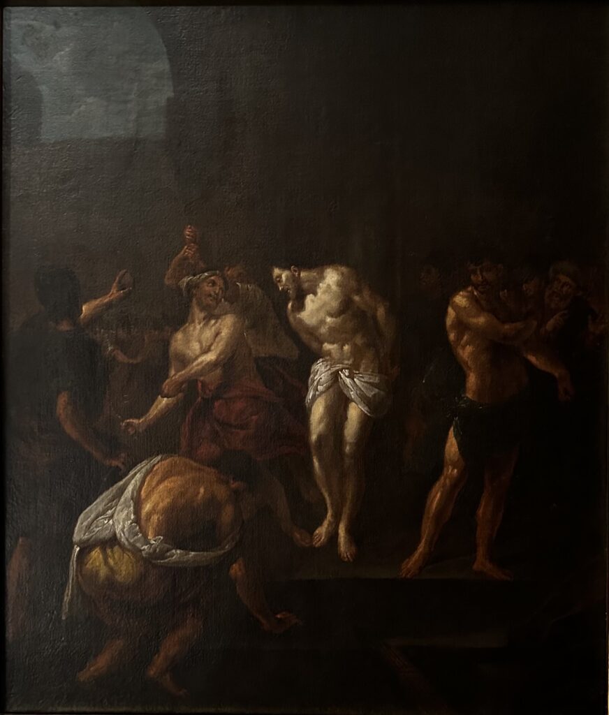 Scena biczowania rozgrywa się w ciemnej scenerii. W centrum umieszczona postać Chrystusa w otoczeniu oprawców.