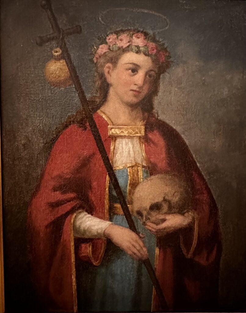 Obraz przedstawiający świętą Rozalie z atrybutami: czaszka oraz krzyż z przewieszonym naczyniem glinianym.